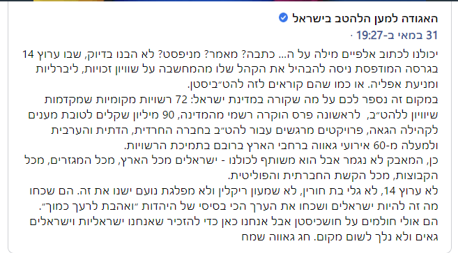 האגודה למען הלהט"ב מתגאה, מחד, בהיותה ארגון בעל כוח פוליטי עצום בלי לוותר על הזכות להשתלח ולהסית כנגד מי שמבקר אותם, כאילו היו פרטים חלשים ונרדפים ובכך להוכיח את נכונות הביקורת. תודה, אגודה.
